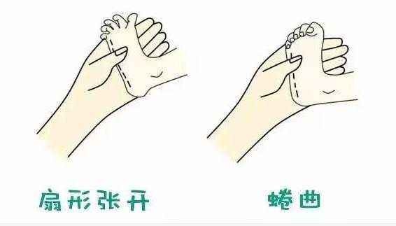 当爸爸妈妈由脚跟向前轻划宝宝的足底外侧缘时,宝宝的拇扯会缓缓地上跷,其余各趾呈扇形张开,然后再蜷曲起来,这就是宝宝的巴宾斯基反射。