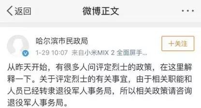 事发至今已过去两年时间,牺牲民警曲玉权仅在案发半年后被追认为公安二级英模,却迟迟未被评定为“烈士”,引发了网友不满。特别是1月29日,青岛民警别立福在牺牲10天后即被山东省人民政府评定为烈士的消息传出后,舆论质疑更甚。1月29日,@哈尔滨市民政局 回应称,烈士评定相关政策请咨询退役军人事务局,被网友质疑踢皮球。