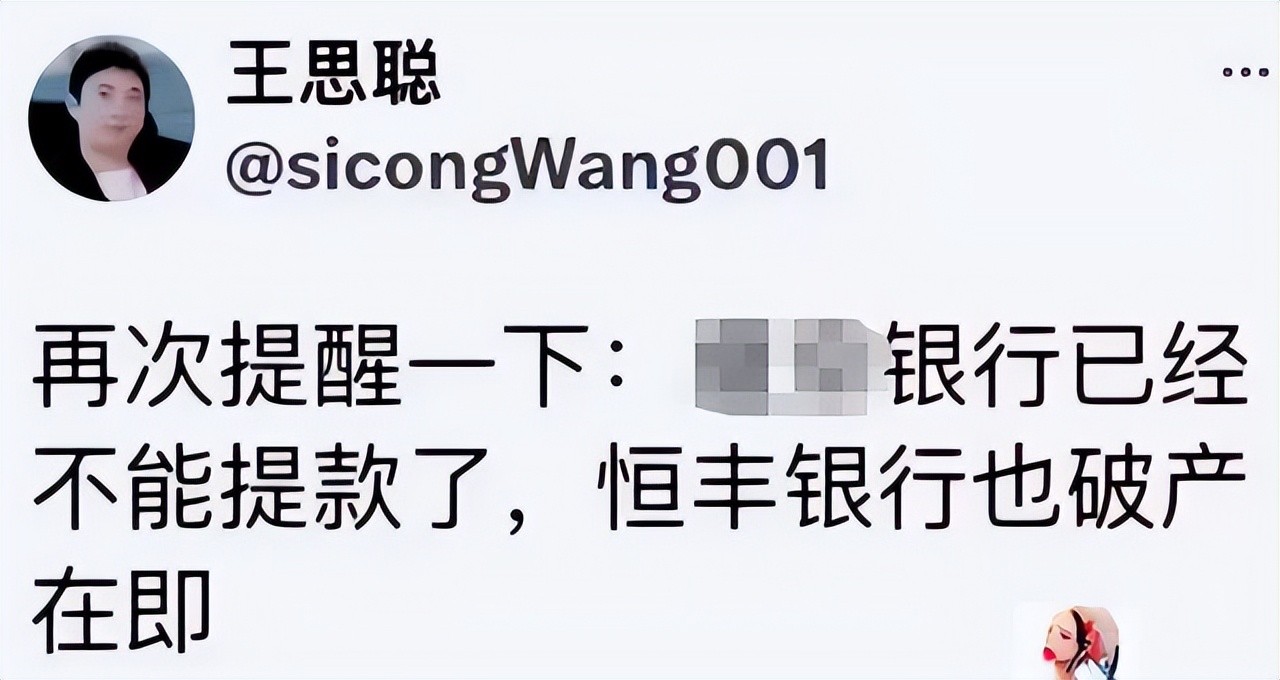 原来前几日的“推特”上,一个名为“王思聪”的账号,曝料国内两家银行已岌岌可危,其中特别点名“恒丰银行也破产在即”。