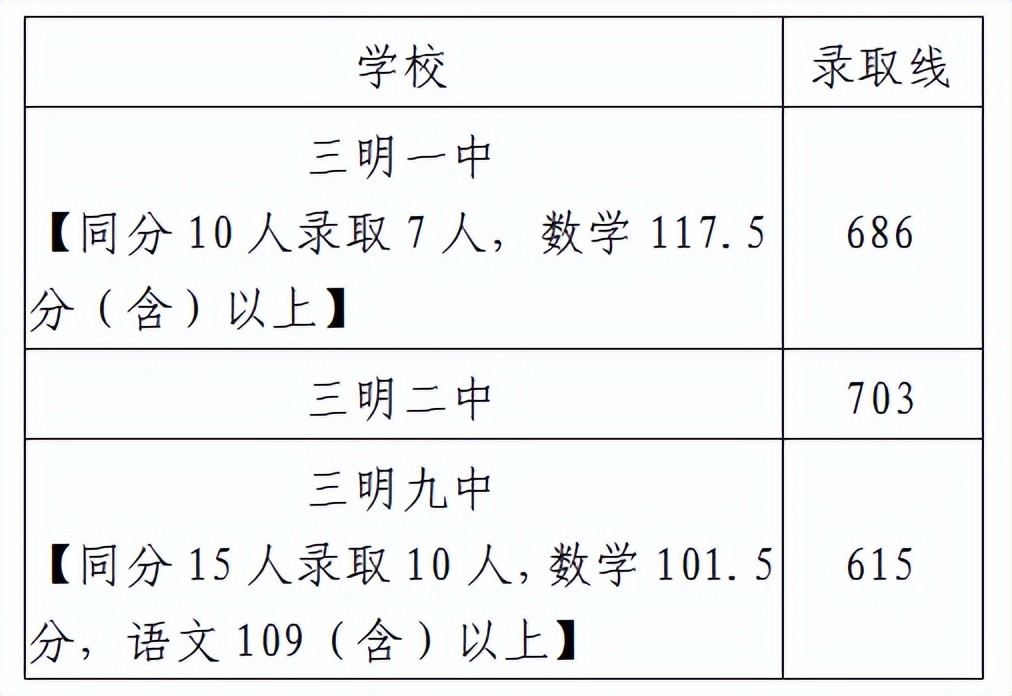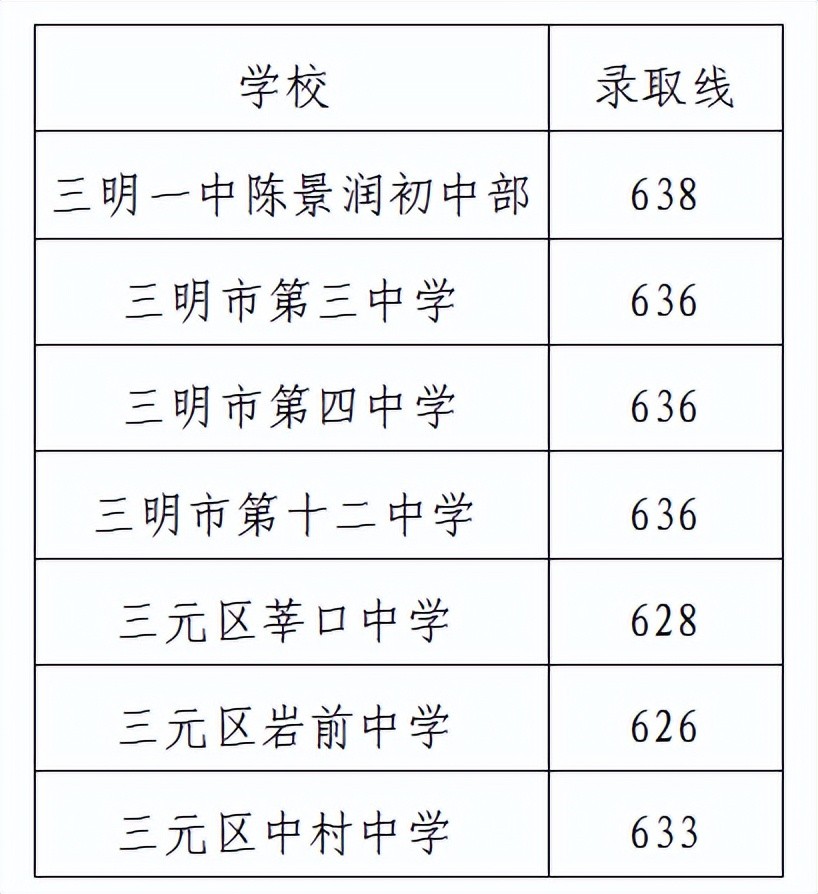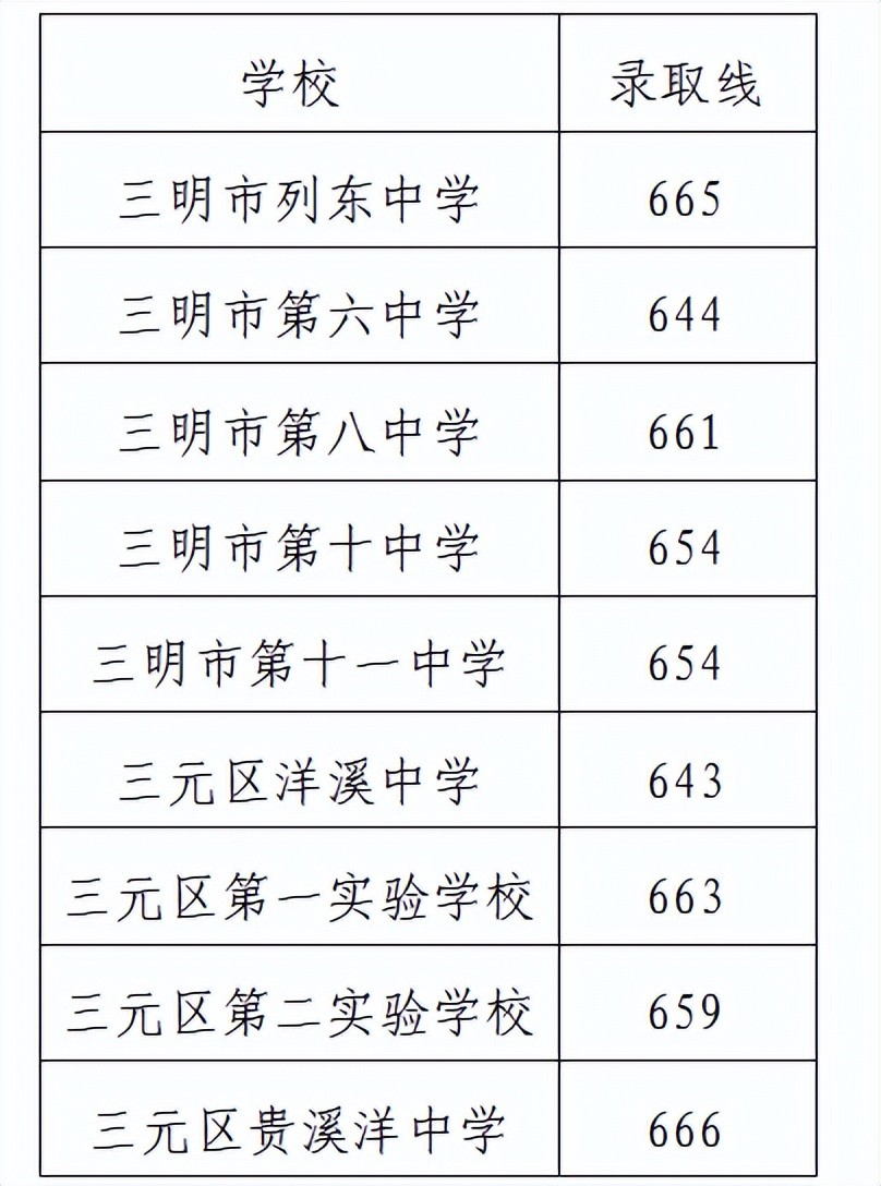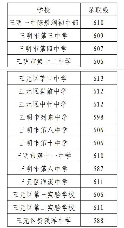 三明市直属普通高中招生录取分数线