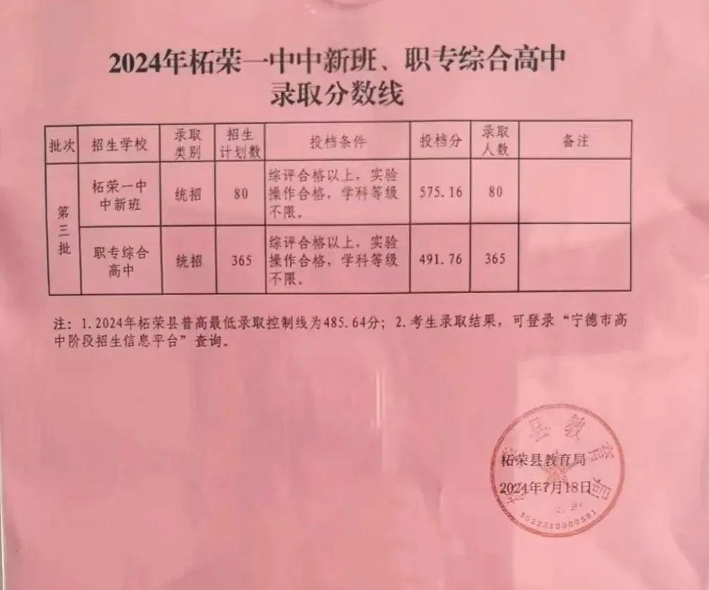 柘荣县第一中学中新班、职专综合高中录取分数线