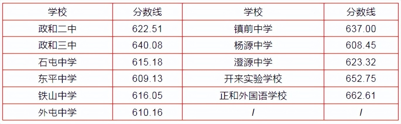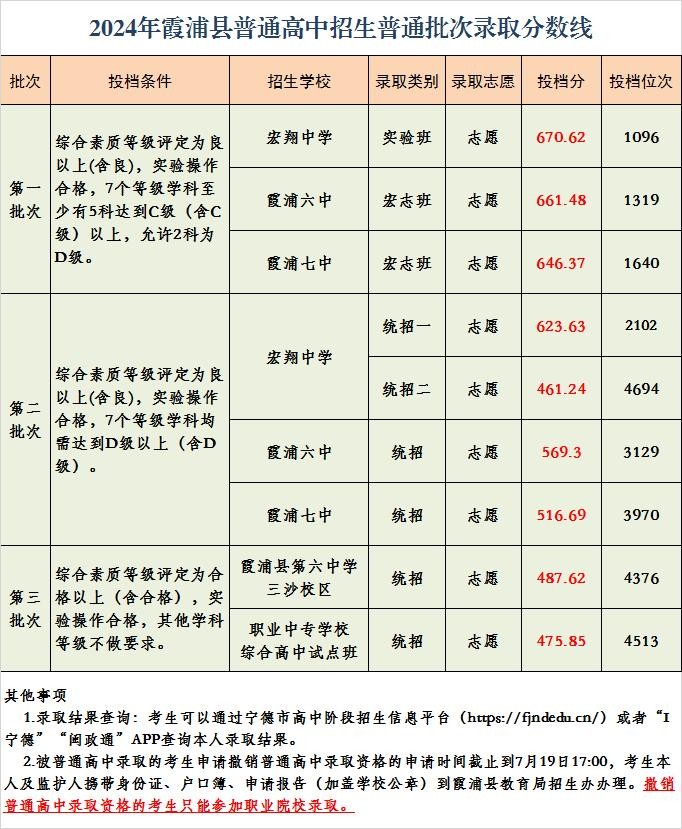 霞浦县普通高中招生普通批次录取分数线