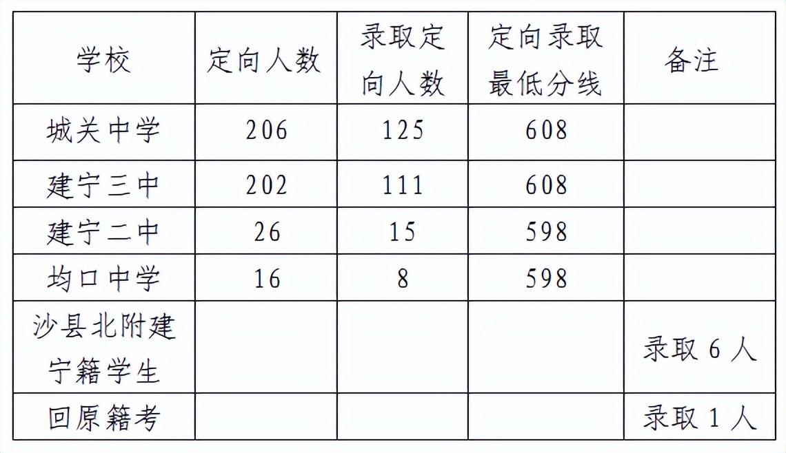 五、建瓯二中定向招生各校录取分数线