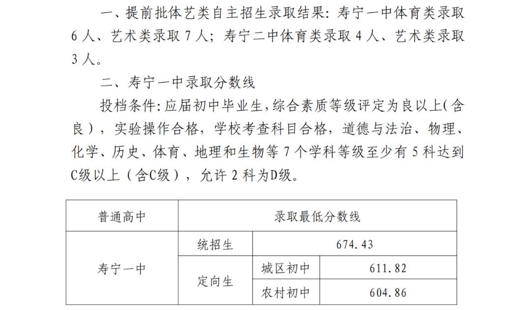 寿宁县普通高中录取分