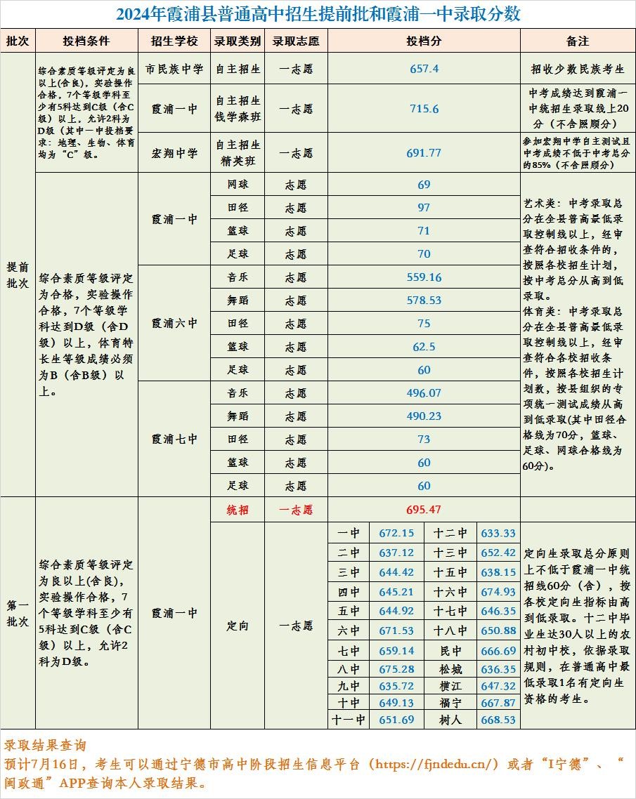霞浦县普通高中招生提前批和霞浦一中录取分数