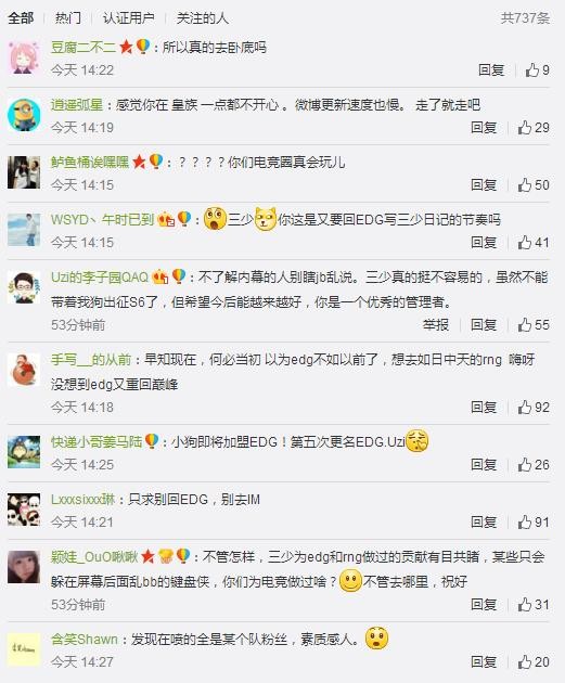 今日下午十分,RNG经理三少发表微博称将离开RNG!消息一出震惊了不少电竞圈人士!