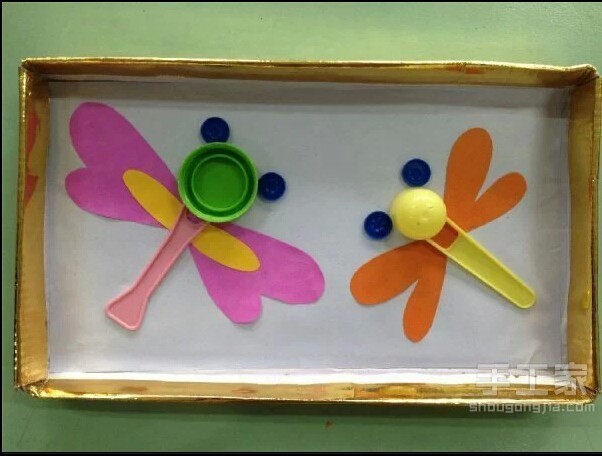 这个蜻蜓,还用到了瓶盖和塑料勺子,和彩纸。