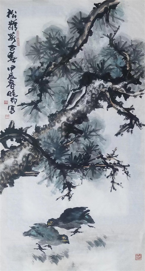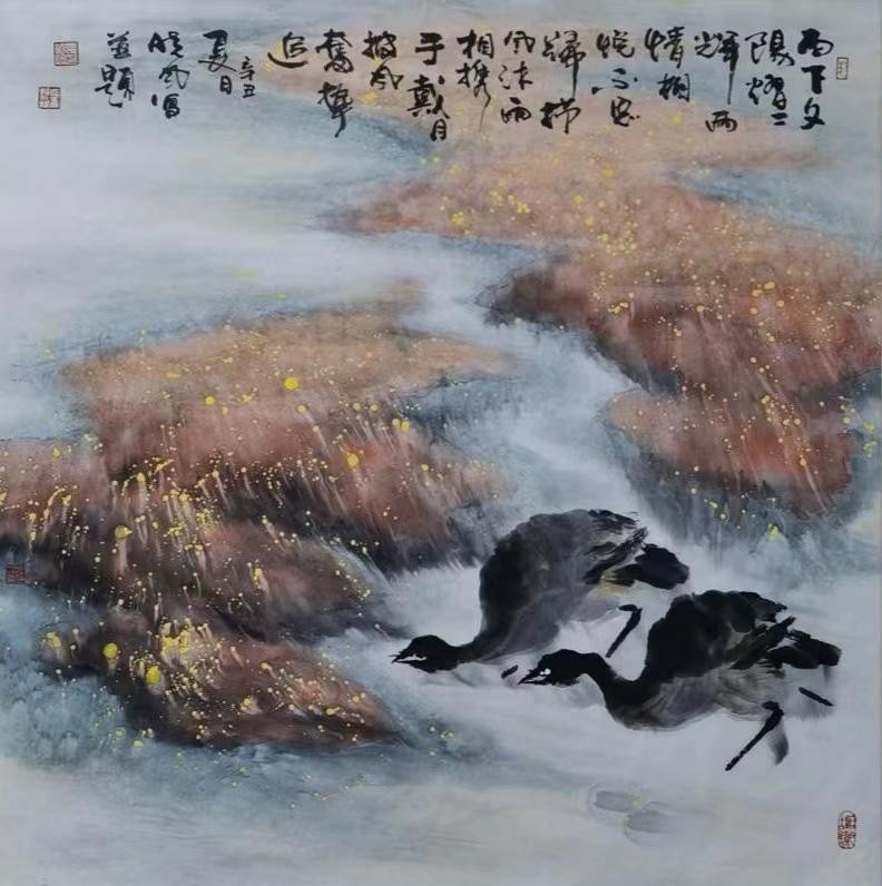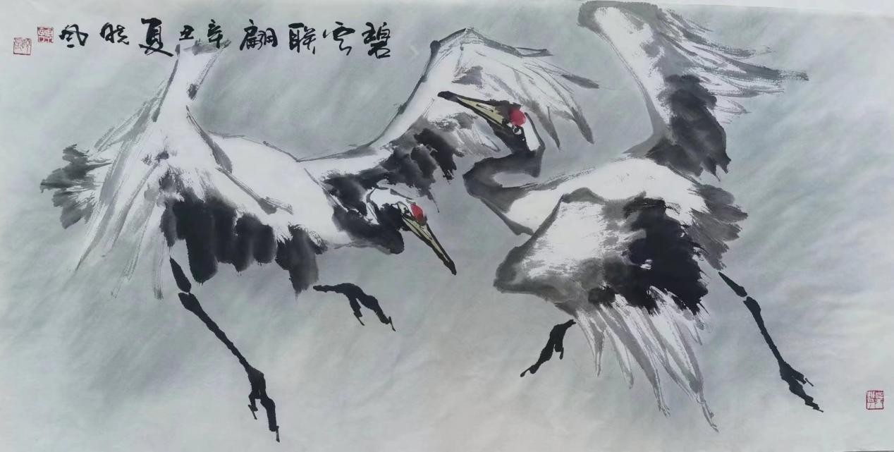 他的花鸟作品之生成,有写生求真的宗旨,绝不把自己闲居在书房做“臆画”,必是走进自然写生态,不画未见之物。见之入目,必察之入心,然后胸有成竹运行笔墨,成为 5000 年中國大写意花鳥畫《中華珍禽圖》120 米長卷的第一人!郑板桥以画竹而得名,齐白石以画虾而得名,名家自有独享专题。谭晓风以詩入画,以畫各种珍禽闻名遐迩,让天地之间的生灵,成为笔墨铺陈出来的丹青奇观。无论是鹤的姿态与神态、背景与情景都是师于造化,经过心化酝酿,尔后落于笔端的生动传神。