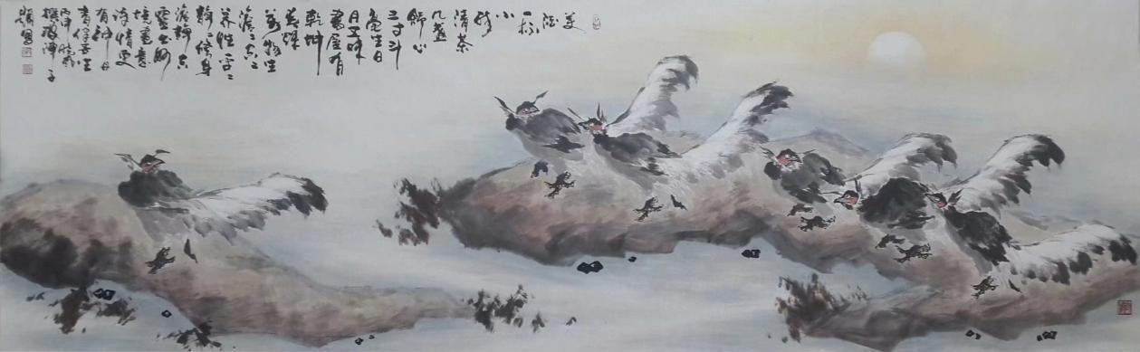谭晓风作丹青题材广泛,花鸟、山水两大门是为精湛。并且不刻意区分花鸟与山水的绝对界限,有时时可融为一体的新创建。通过俯仰天地的视角,把天空、大地、云烟、川流统摄于一起,大境界、大结构、大铺陈,然后把代表生命的珍禽奇卉写意成画面主角,放大它们的存在感,人与自然和諧共生的大意境,通过体势的夸张,成为生命磅礴的意象。这种独特的、富有气势的结构方式,把鹤画成了龙腾神灵。在色不碍墨,墨不碍色的渲染中,写意出海是龙世界,云是鹤家乡的磅礴浩莽!