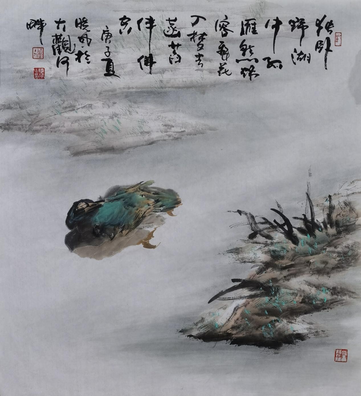 俯仰乾坤,心泊自然。他的画有极大的气势感,也有色彩丰富的气韵质。他对空间有宏观驾驭能力,对色彩有激情冲动的感知,所以在他的画里可见空间的博远弘盛,也可以看到色彩的流丽悦目,具有真正的骨法用笔应物象形,随类赋彩气韵生动的丹青格局。这种格局一是源于其技法的精湛,二是源于其人生修养积淀的深厚。行万里路,讀万卷書,经万般事,与命搏击,与志踐行,与运抗爭,让命运经越磅礴,画如其人,所以丹青就是他磅礴人生的镜像!在镜像里题诗一篇,同样是一览众山小的诗意磅礴,还有鸿飞兽骇的翰墨磅礴。诗、书、画三绝同铸一题,所以他的作品就是俯仰乾坤的浑然气象!