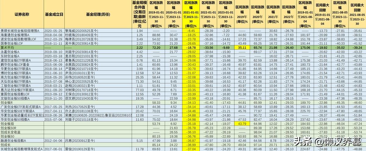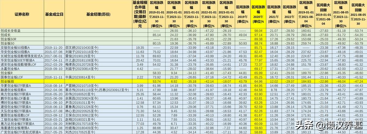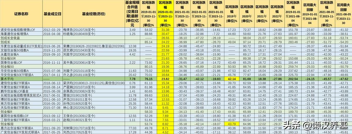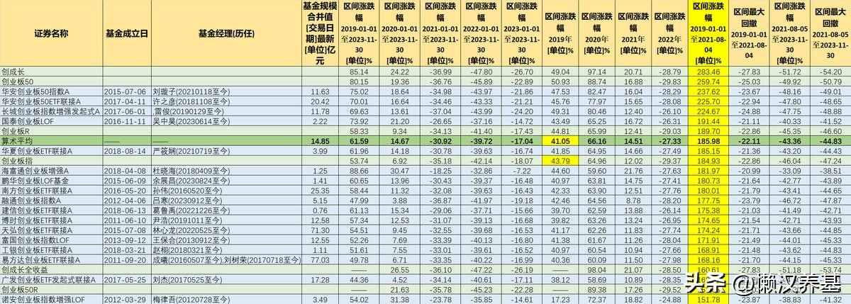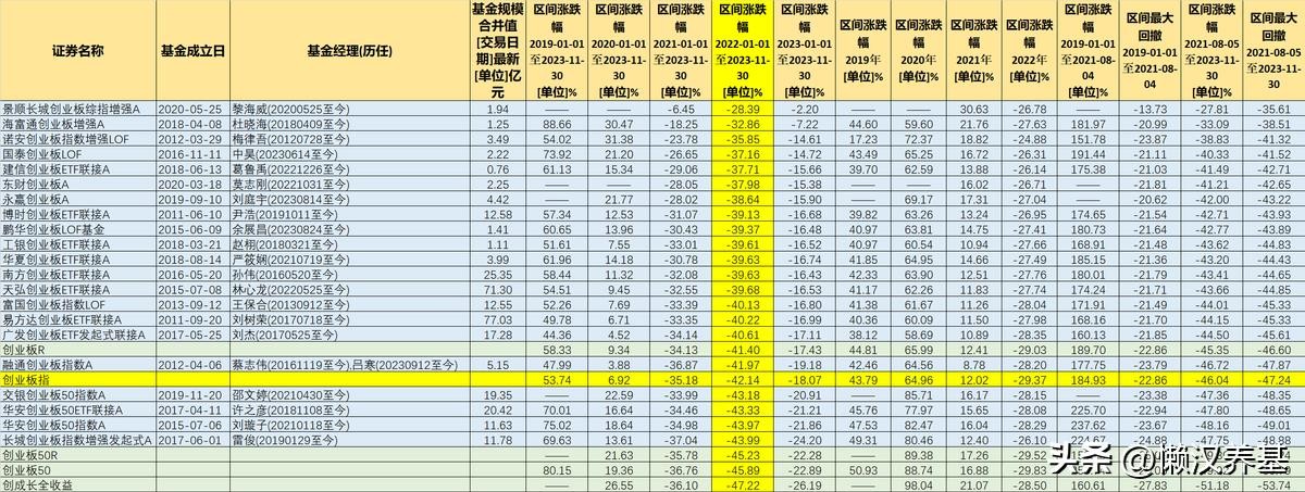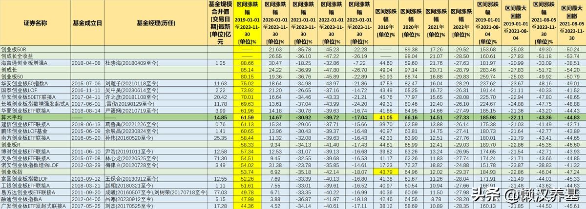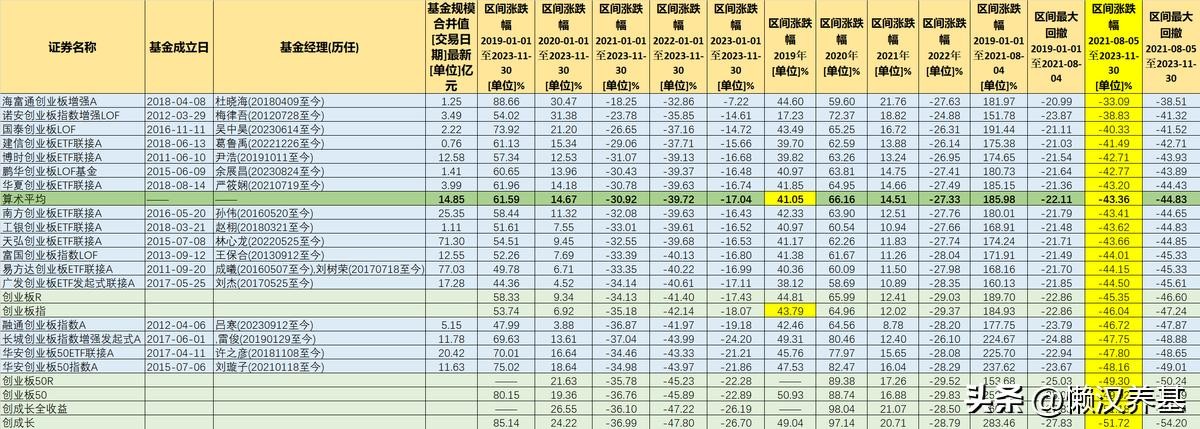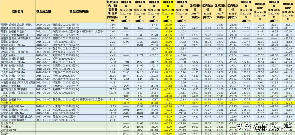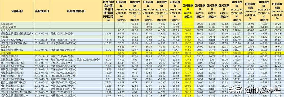 2019年以来至2023年11月30日,有完整回报数据的创业板指数基金一共17只,详见下表。