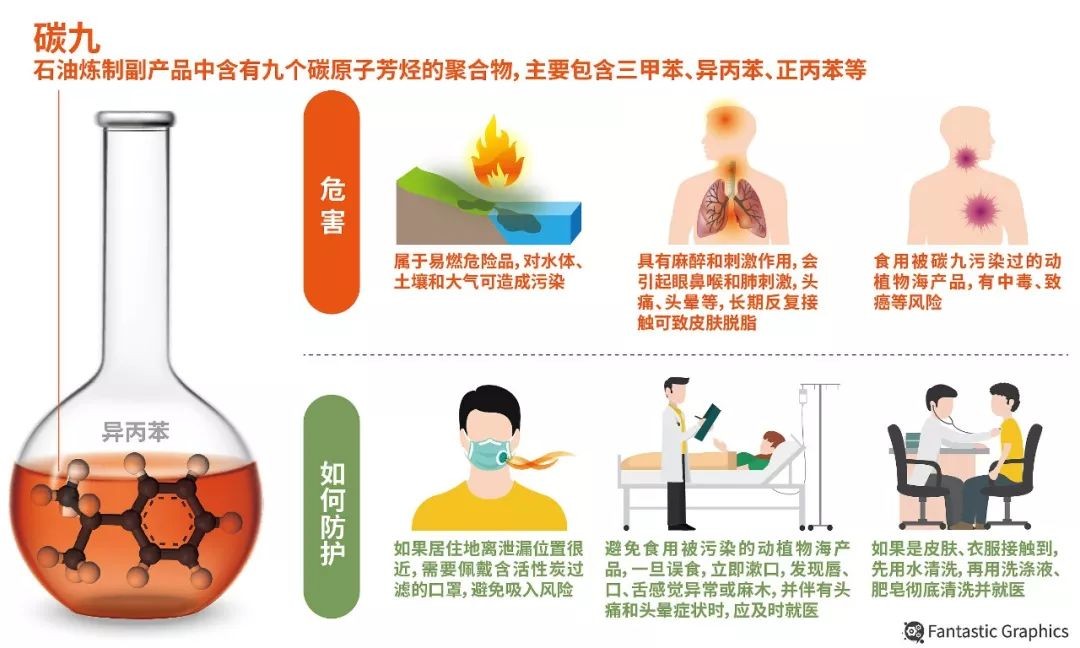 “碳九”(C9)是石油提炼时获得的碳氢化合物,作为石油树脂类原料,主要用于油漆、防腐涂料等领域。裂解碳九是刚刚从石油中裂解出来的碳九,主要为脂肪烃,不带有苯环,其状态与气味均与汽油非常相似,挥发性大,会带来持续一定时间的空气污染。但毒性相对不大,也没有已知致癌风险。