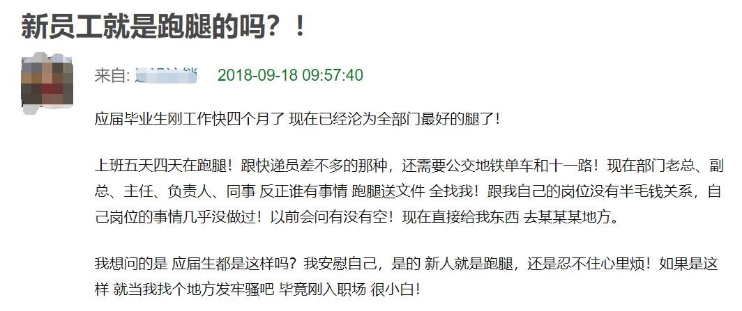上班五天四天都在跑腿,跟快递员差不多,现在部门老总、副总、负责人、同事有事都找我跑腿,跟我的岗位没有半毛钱关系,自己岗位的事情几乎没做过……应届毕业生都是这样的吗?