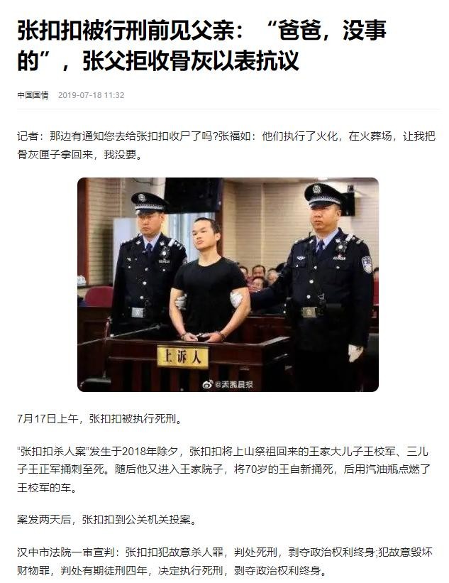 中国国情在2019年7月18日《张扣扣被行刑前见父亲:“爸爸,没事的”,张父拒收骨灰以表抗议》的报道