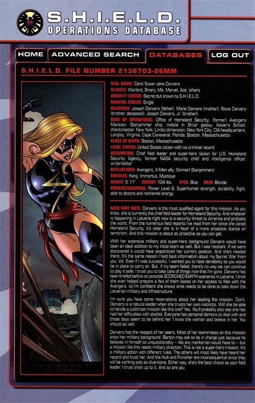 卡罗尔·丹佛斯是一名空军军官,被招募至军事情报部门,不知不觉间与惊奇队长马维尔一同介入了克里人的间谍行动。克里人永罗格随后在与马维尔的战斗中绑架了她,在这期间,她意外被称为心灵磁控管的外星装置照射到,卡萝的遗传结构被实质地改变,使她成为一名半克里人的超人类。这赋予了她超人的力量和速度、飞行能力、千里眼般的第七感和克里人战士的所有战斗技巧。藉由这些力量,她确立自己成为了惊奇女士。后来,在与有着吸收能力的变种人罗刹的战斗中,丹佛斯失去了几乎所有惊奇女士的能力。然而,经过外星种族Brood的绑架和实验,激发了她增强基因的潜在潜能,因此她成为拥有惊人宇宙力量的双星。双星可以汲取白洞的能量,白洞是一个空间区域,一个奇异点从这个宇宙进入另一个宇宙的最终向内坍塌的出口点。这种跨维度的缺口是一个弱点,双星能够将一小部分宇宙能量转移,成为精神触发的对她周围的时空连续体的扰动。她能够将这些扰动塑造成各种透镜,集中或扩散这些相对巨大的能量,产生众多星辰般的效果。双星能够辐射热量、光线以及其余的电磁波谱和重力。据推测,她可以表现出的能量总量与她允许在宇宙之间打开的截面或窗口有关。例如,一个八英寸直径的洞在奇异点的表面会释放出各种能量的洪流。双星显然能够对这些能量采取精神过滤,只允许她选择的能量通过。双星汲取的能量赋予她Class 100的力量,她可以举起超过一百吨。通过单向引导恒星能量,她有一种推进手段使她能够以接近光速飞行。她是否可以穿越跨宇宙地带独立旅行尚不得而知。她也对环境宇宙能量的流动敏感,赋予她某些增强的感知能力。双星有一股稳定的冷〝伪火焰〞在她的头部和手部周围以球状闪烁着,代表她最集中的区域。双星的物理形态的局限性尚不清楚,但是她能够维持在双星状态的时间有限。在大量消耗恒星能量之后,她会恢复到人类形态,必须休息一段时间。她确切的限制尚不得而知。作为战鸟,丹佛斯最终加入了复仇者,但那时,她的宇宙力量已经消退到剩下它们曾经有过的一小部分。丹佛斯仍然保留了较小规模的双星力量,使她能够吸收环境能量,并以光子的形式投射。当吸收足够的能量后,她可以暂时采取双星的形态。秘密入侵期间,克里帝国利用M'Kraan水晶复活了马维尔,以团结和保护克里免受凤凰之力袭击,马维尔最终牺牲自己来拯救Hala星。意识到马维尔对她的意义,丹佛斯决定继承他的遗志,在之后成为了新任的惊奇队长。