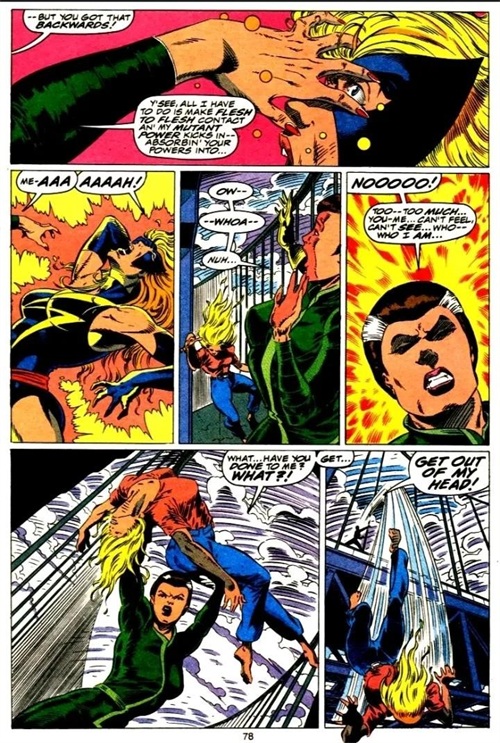 在与罗刹的战斗中,由于接触身体的时间过长,罗刹永久地吸走了卡罗尔所有的力量和记忆。