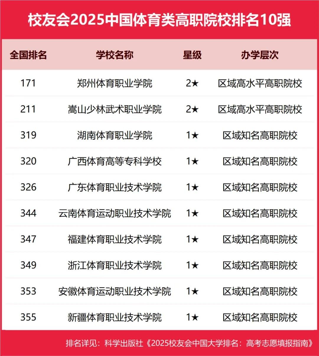 郑州体育职业学院、嵩山少林武术职业学院、湖南体育职业学院、广西体育高等专科学校、广东体育职业技术学院位列2025中国体育类高职院校排名5强。