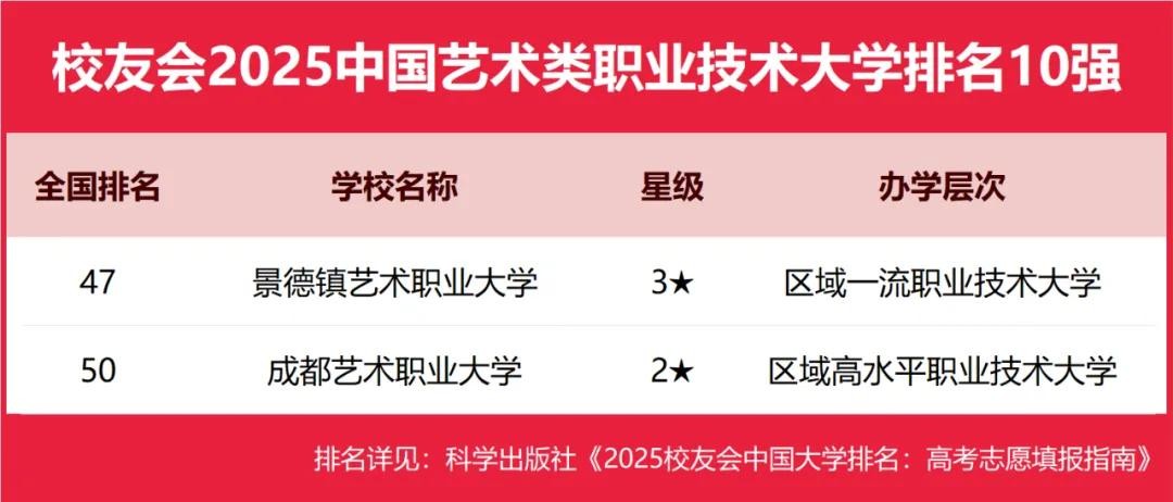 景德镇艺术职业大学、成都艺术职业大学位列2025中国艺术类职业技术大学排名5强。