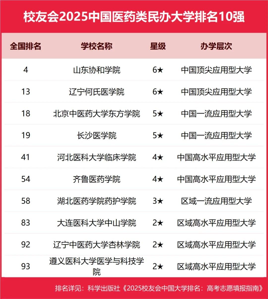 山东协和学院、辽宁何氏医学院、北京中医药大学东方学院、长沙医学院、河北医科大学临床学院位列2025中国医药类民办大学排名5强。