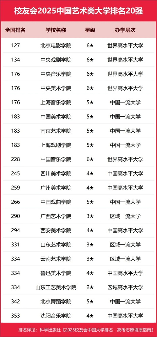 北京电影学院、中央戏剧学院、上海音乐学院、中央美术学院、中央音乐学院位列2025中国艺术类大学排名5强。