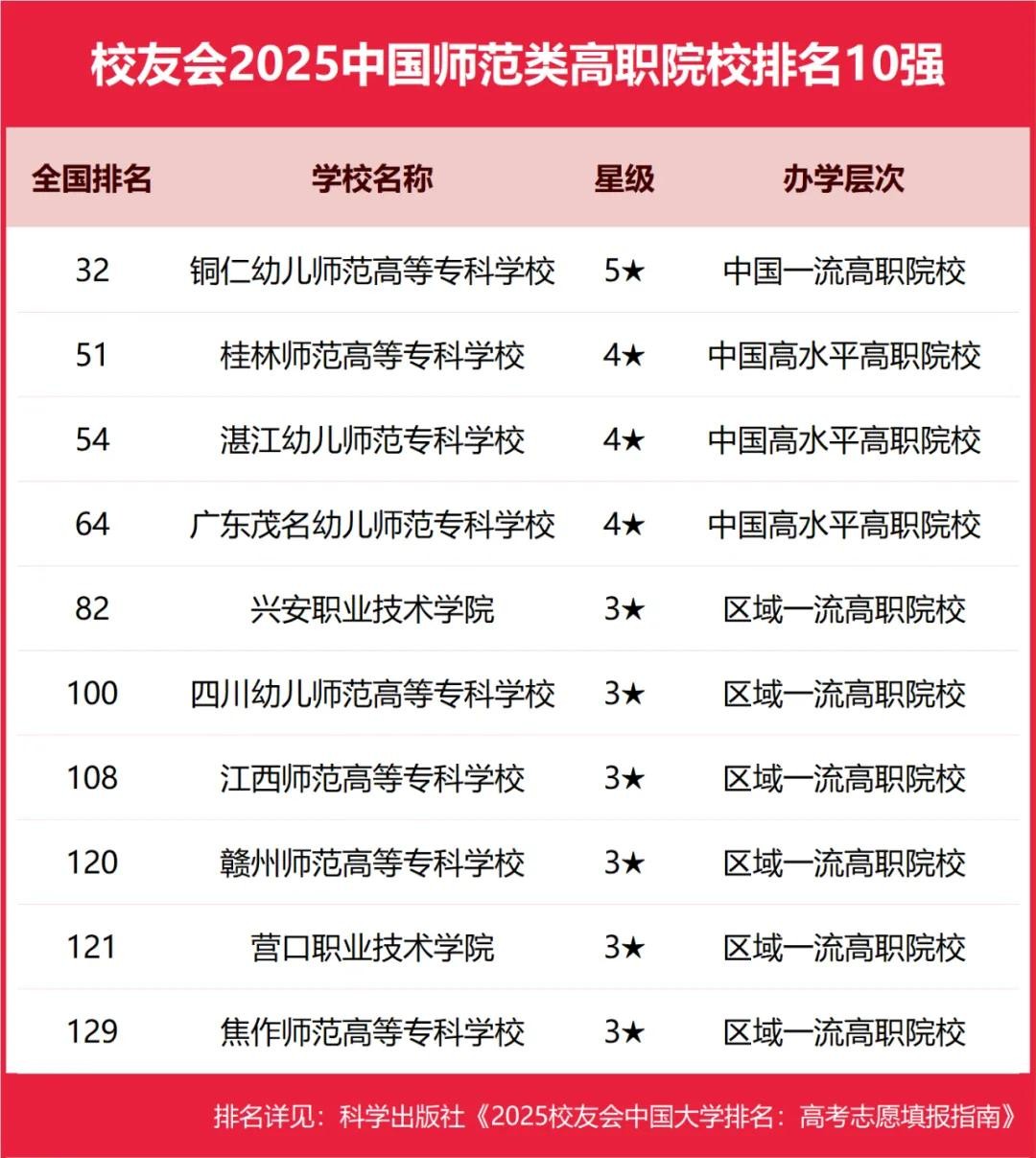 铜仁幼儿师范高等专科学校、桂林师范高等专科学校、湛江幼儿师范专科学校、广东茂名幼儿师范专科学校、兴安职业技术学院位列2025中国师范类高职院校排名5强。