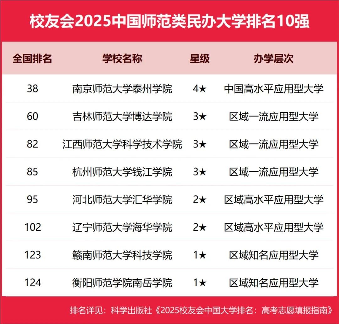 南京师范大学泰州学院、吉林师范大学博达学院、江西师范大学科学技术学院、杭州师范大学钱江学院、河北师范大学汇华学院位列2025中国师范类民办大学排名5强。