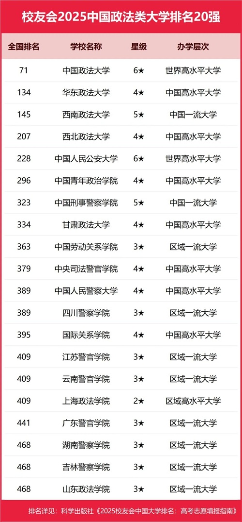 中国政法大学、华东政法大学、西南政法大学、西北政法大学、中国人民公安大学位列2025中国政法类大学排名5强。