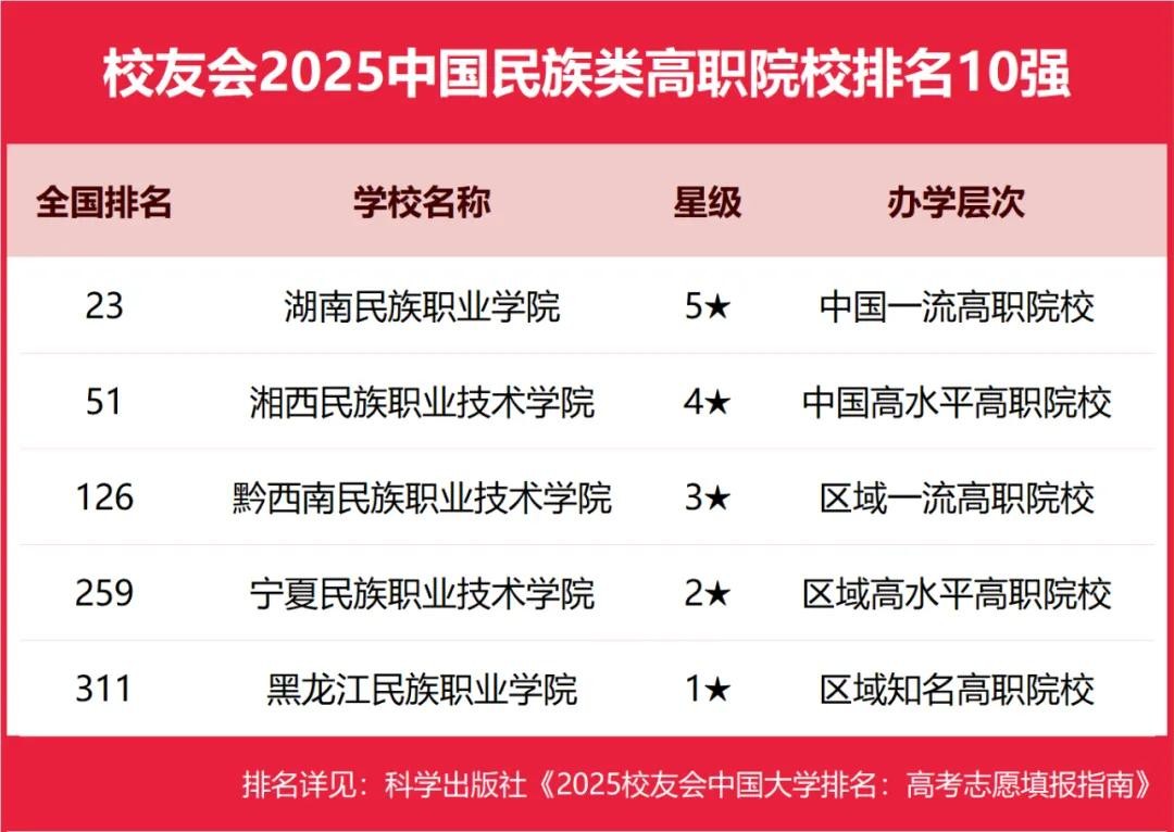 湖南民族职业学院、湘西民族职业技术学院、黔西南民族职业技术学院、宁夏民族职业技术学院、黑龙江民族职业学院位列2025中国民族类高职院校排名5强。