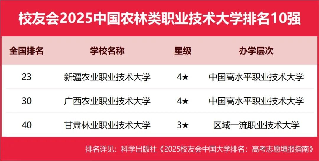 新疆农业职业技术大学、广西农业职业技术大学、甘肃林业职业技术大学位列2025中国农林类职业技术大学排名5强。