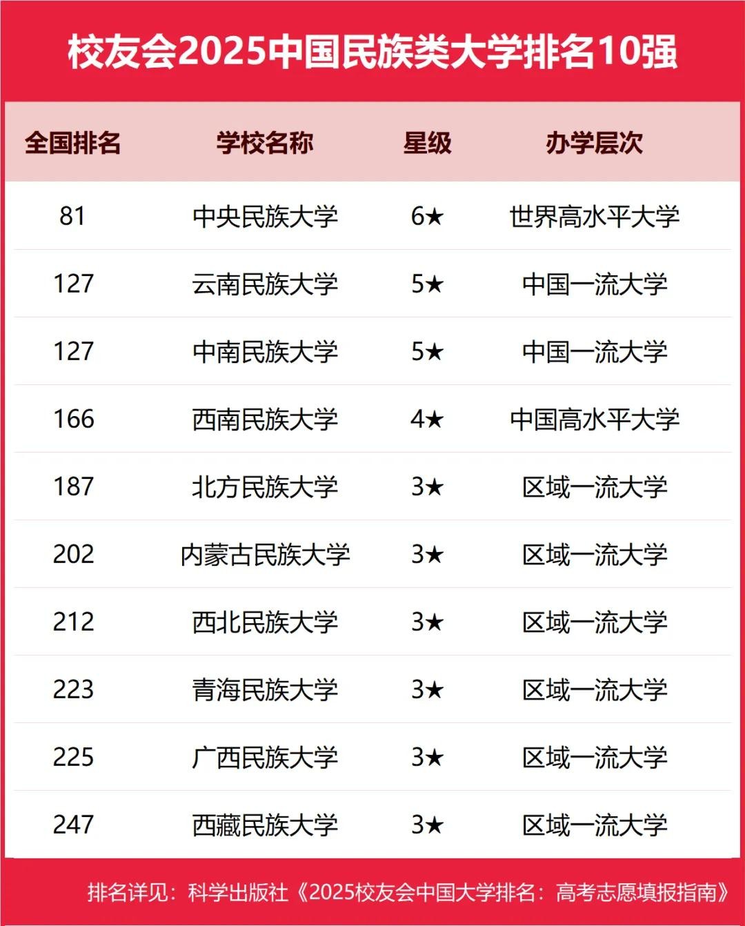 中央民族大学、云南民族大学、中南民族大学、西南民族大学、北方民族大学位列2025中国民族类大学排名5强。