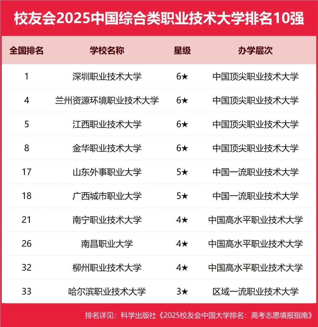 深圳职业技术大学、兰州资源环境职业技术大学、江西职业技术大学、金华职业技术大学、山东外事职业大学位列2025中国综合类职业技术大学排名5强。