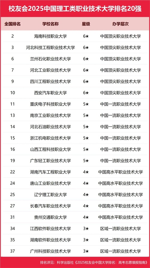 海南科技职业大学、河北科技工程职业技术大学、兰州石化职业技术大学、河北工业职业技术大学、四川工程职业技术大学位列2025中国理工类职业技术大学排名5强。