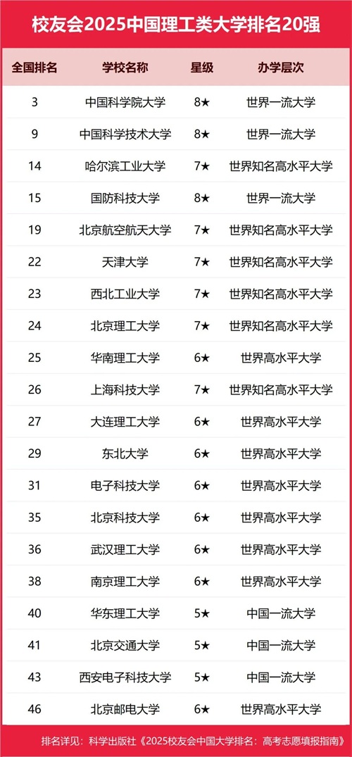 中国科学院大学、中国科学技术大学、哈尔滨工业大学、国防科技大学、北京航空航天大学位列2025中国理工类大学排名5强。