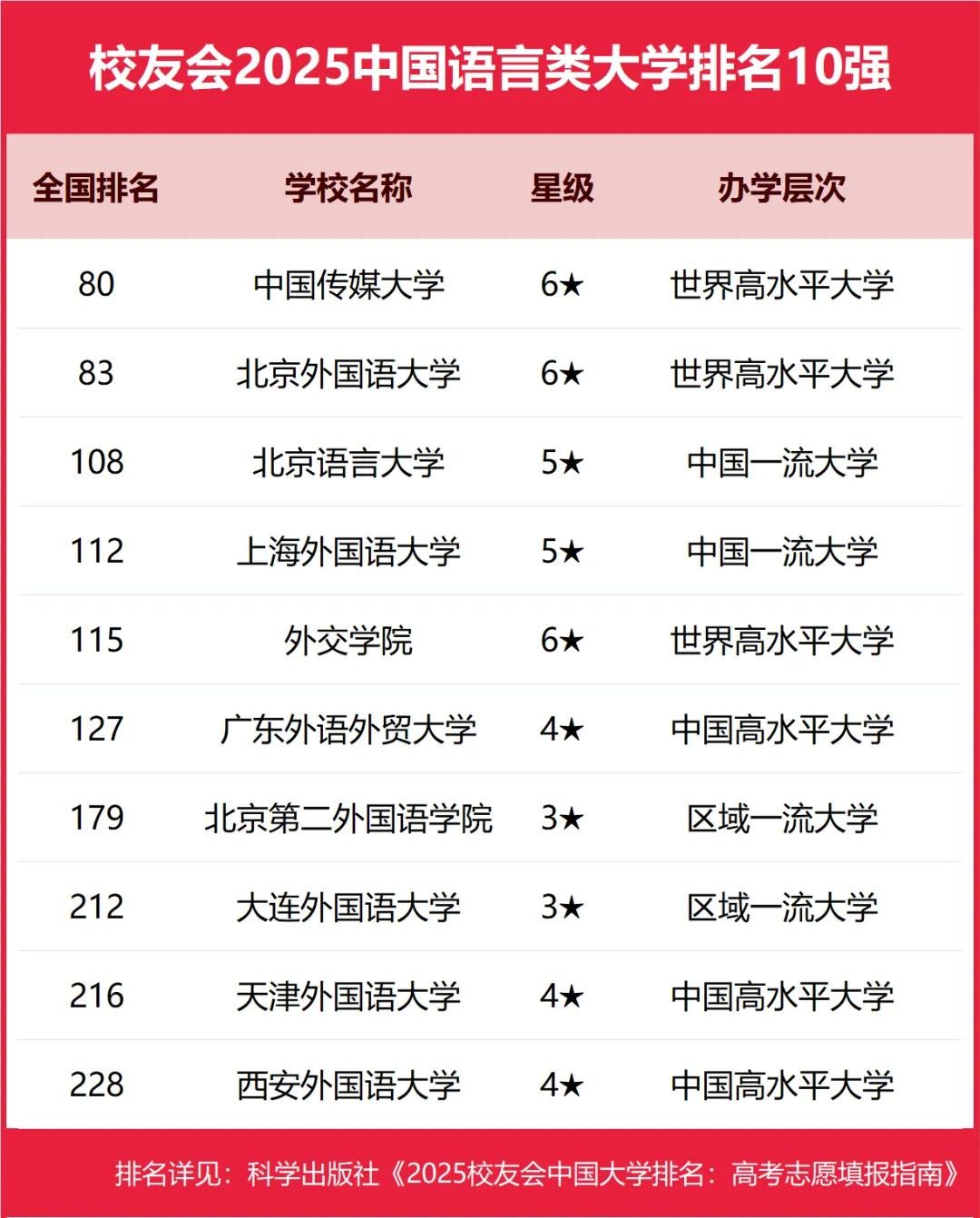 中国传媒大学、北京外国语大学、北京语言大学、上海外国语大学、外交学院位列2025中国语言类大学排名5强。