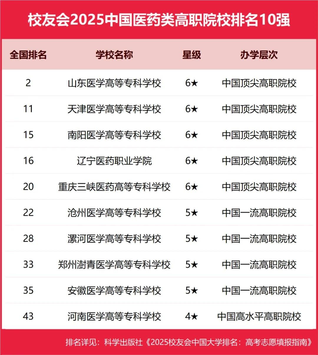 山东医学高等专科学校、天津医学高等专科学校、南阳医学高等专科学校、辽宁医药职业学院、重庆三峡医药高等专科学校位列2025中国医药类高职院校排名5强。