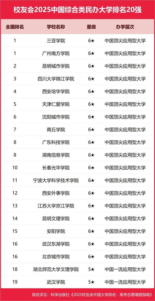 三亚学院、广州南方学院、昆明城市学院、四川大学锦江学院、西安培华学院位列2025中国综合类民办大学排名5强。