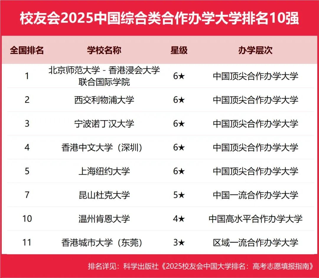 北京师范大学-香港浸会大学联合国际学院、西交利物浦大学、宁波诺丁汉大学、香港中文大学(深圳)、上海纽约大学位列2025中国综合类合作办学大学排名5强。