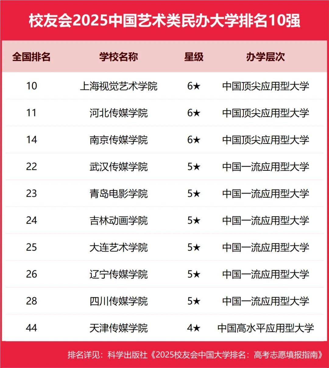 上海视觉艺术学院、河北传媒学院、南京传媒学院、武汉传媒学院、青岛电影学院位列2025中国艺术类民办大学排名5强。