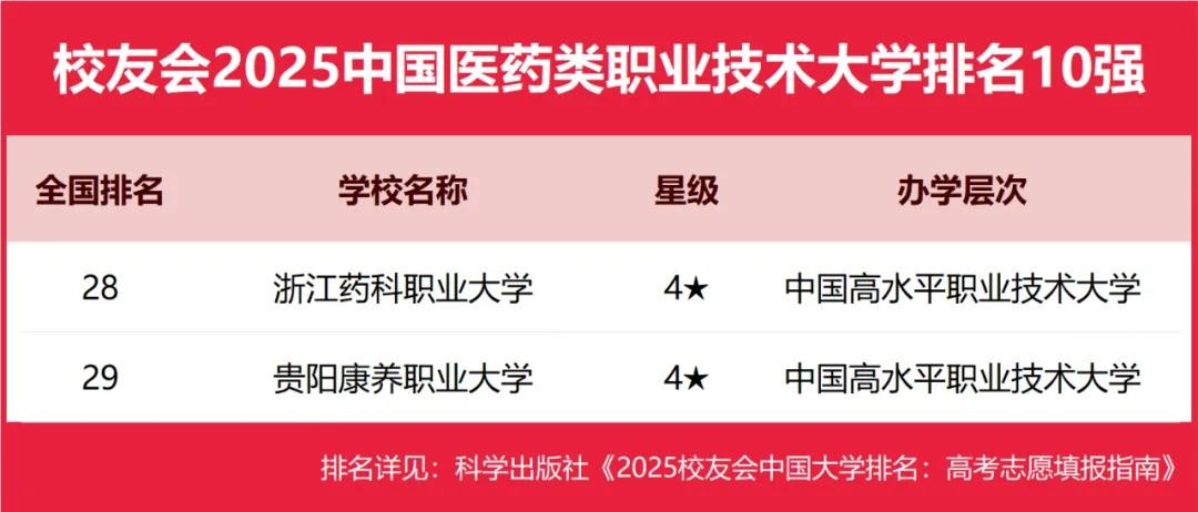 浙江药科职业大学、贵阳康养职业大学位列2025中国医药类职业技术大学排名5强。