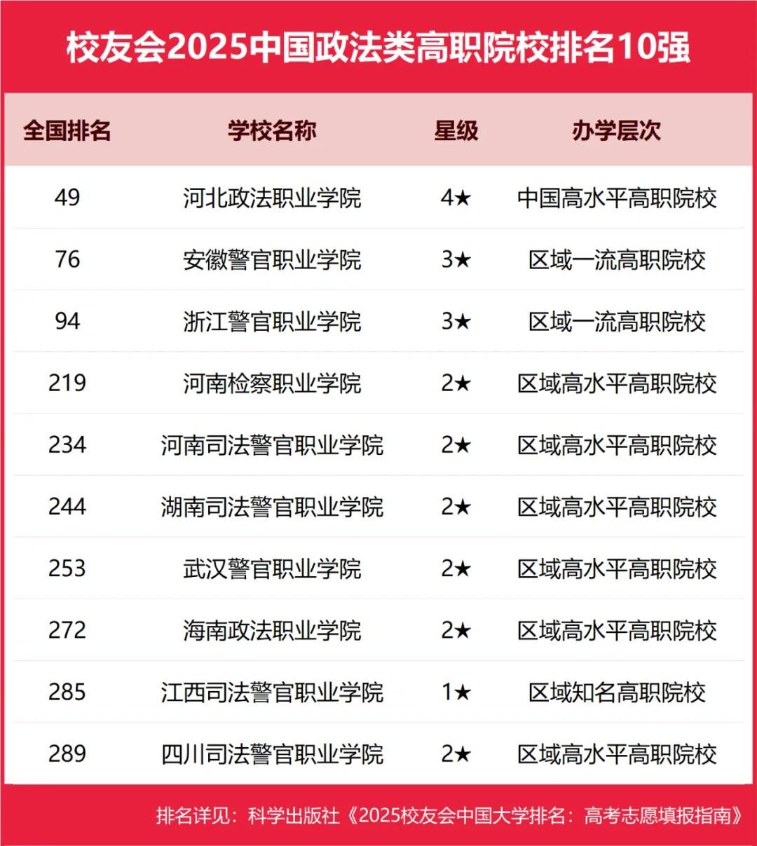 河北政法职业学院、安徽警官职业学院、浙江警官职业学院、河南检察职业学院、河南司法警官职业学院位列2025中国政法类高职院校排名5强。
