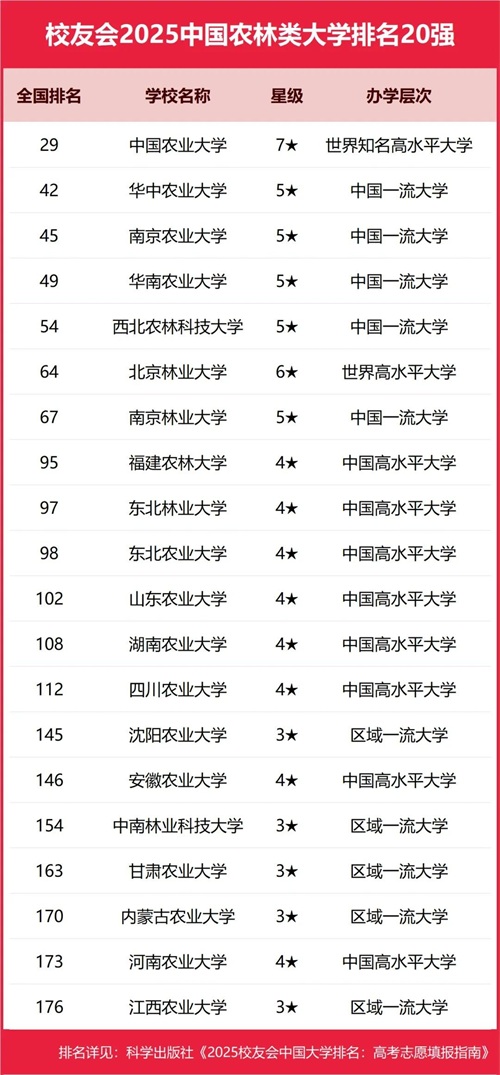 中国农业大学、华中农业大学、南京农业大学、华南农业大学、西北农林科技大学位列2025中国农林类大学排名5强。