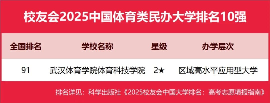 武汉体育学院体育科技学院位列2025中国体育类民办大学排名第一。