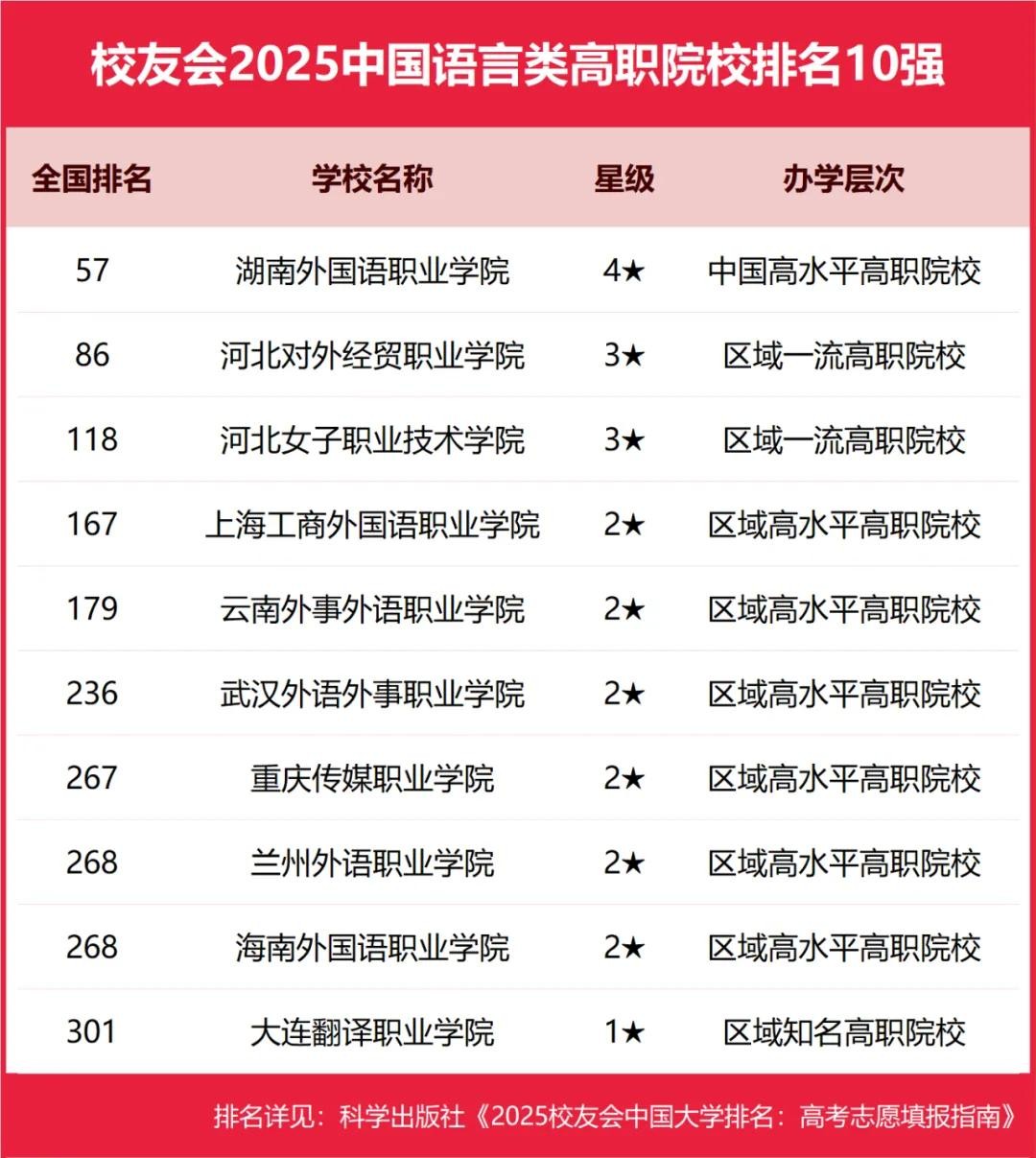 湖南外国语职业学院、河北对外经贸职业学院、河北女子职业技术学院、上海工商外国语职业学院、云南外事外语职业学院位列2025中国语言类高职院校排名5强。