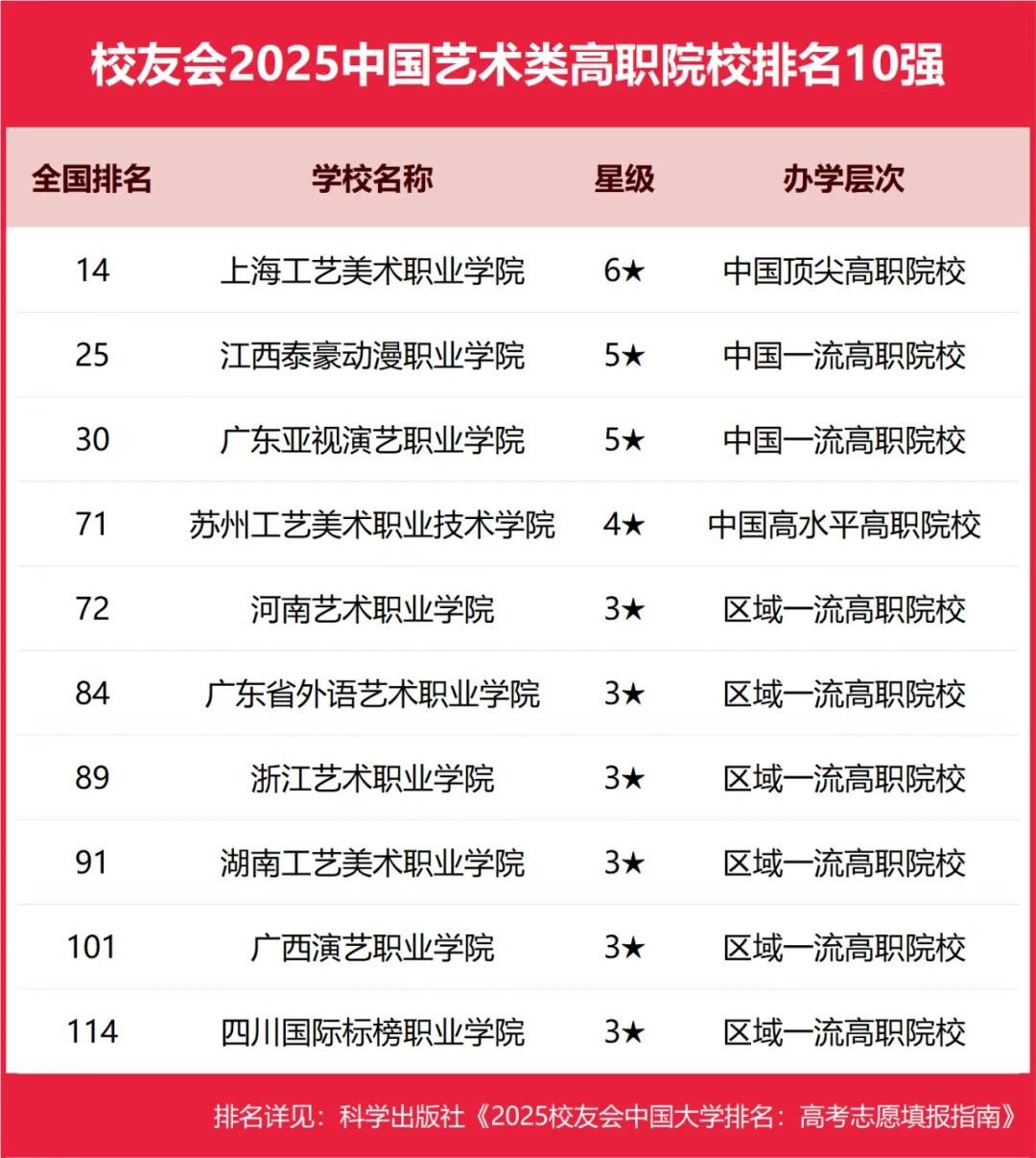 上海工艺美术职业学院、江西泰豪动漫职业学院、广东亚视演艺职业学院、苏州工艺美术职业技术学院、河南艺术职业学院位列2025中国艺术类高职院校排名5强。