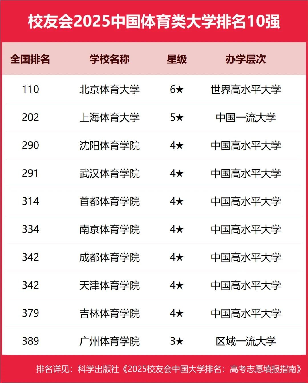 北京体育大学、上海体育大学、沈阳体育学院、武汉体育学院、首都体育学院位列2025中国体育类大学排名5强。