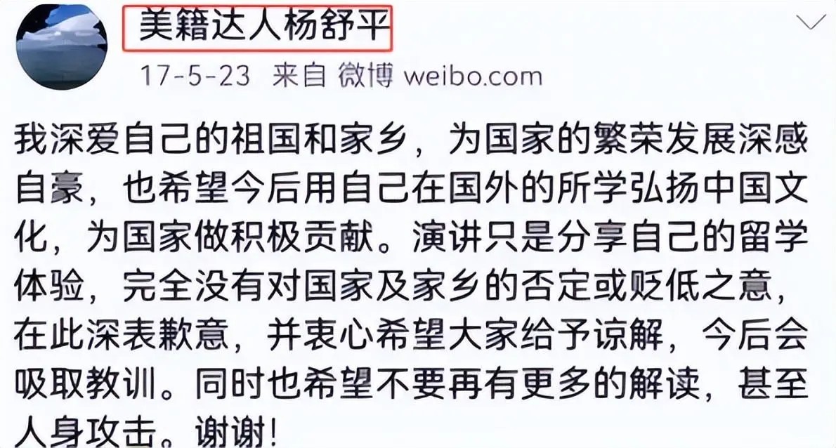 或许是感受到自己这次真的有点闹大了,于是杨舒平很快在社交平台更新了一则道歉声明,直言自己深爱祖国和家乡,自己之前的演讲只是单纯分享自己的留学经验,完全没有对国家以及家乡的否定或贬低。