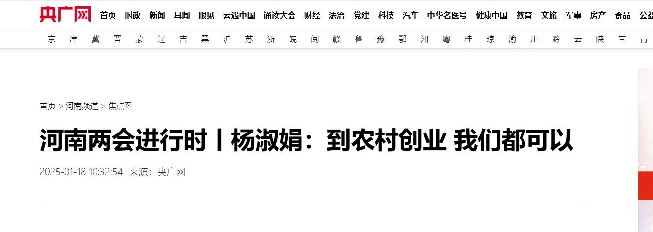 信源:央广网 2025-01-18 10:32:54 《河南两会进行时丨杨淑娟:到农村创业 我们都可以》