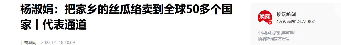 信源:顶端新闻 2025-01-18 10:09《杨淑娟:把家乡的丝瓜络卖到全球50多个国家丨代表通道》