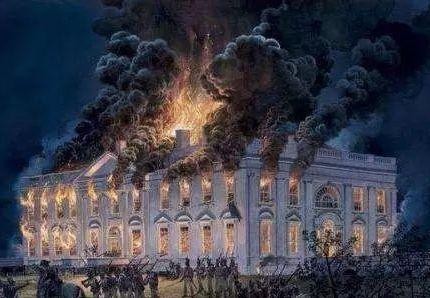 美国海陆军根本无法和英军正面抗衡,1814年8月24日,英国陆军轻易攻占了美国首都华盛顿特区,并焚烧了美国总统府和国会大厦,史称“华盛顿大火”。这是美国第一次,也是唯一一次被外国军队攻入首都。出逃中的麦迪逊遥望首都的大火,心急如焚。