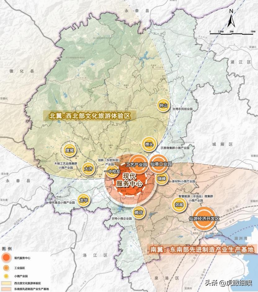 两翼——北翼以钟山、菜溪、西苑、石苍、游洋为重点,大力发展生态旅游业和现代农林业,促进乡村振兴发展;南翼仙游经济开发区为载体,整合联动枫亭、郊尾、盖尾,打造产城融合发展示范区。